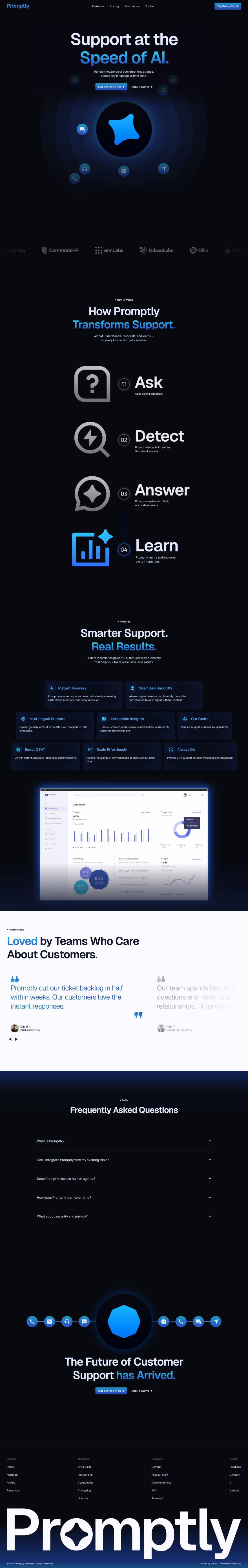 Promptly is a sleek dark Webflow template for AI SaaS startups and tech companies. Designed for customer support and automation platforms, featuring bold typography, smooth hero animation, and high-conversion layouts.